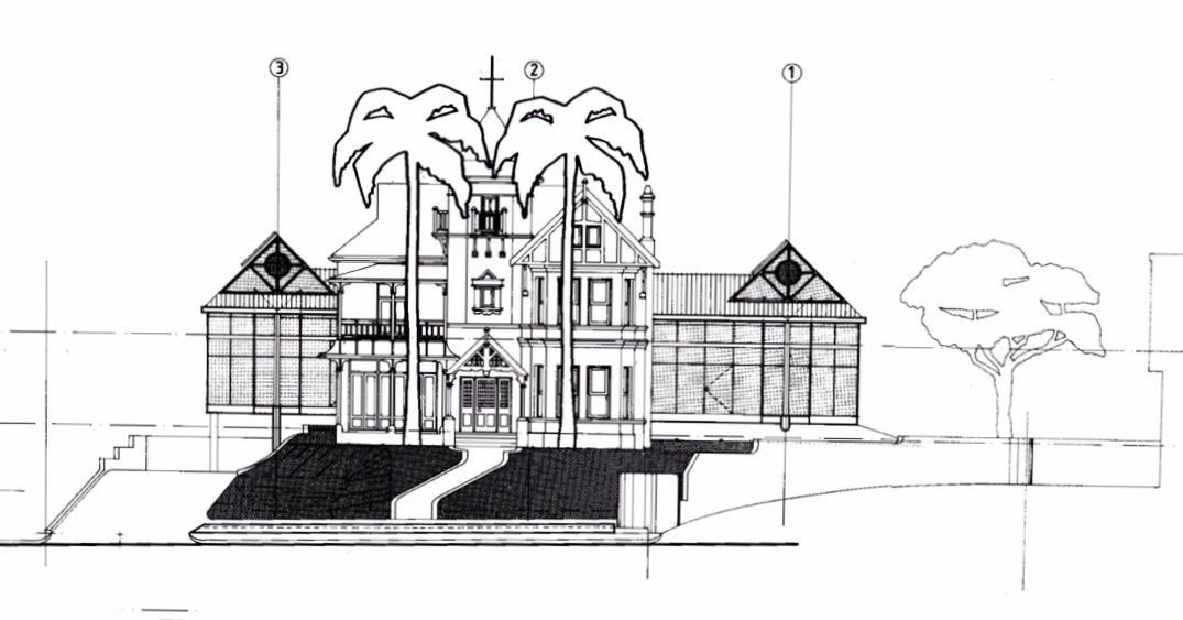 The original house sat as a villa in a lush garden setting. In keeping with the Picturesque tradition, access was designed to unfold obliquely — guiding visitors past mature palm trees that frame the entrance and anchor the house within its landscape. The architecture of the villa, too, was expressive: the verticality of its tower and gables balanced by the horizontal plane of the wide verandah.